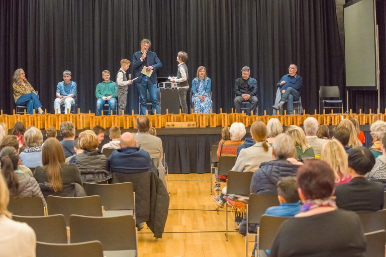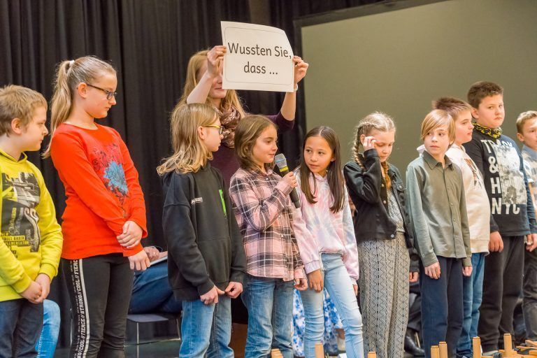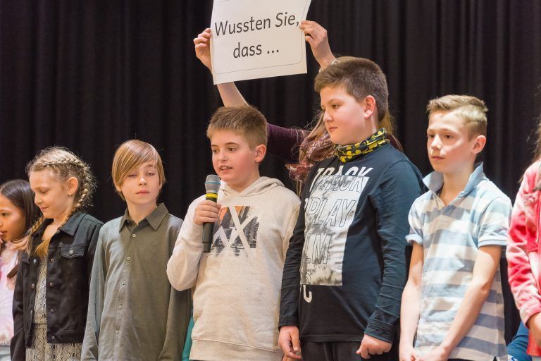 Mit viel Witz und Charme führten die Moderatorenteams der 4. Klasse durch das Programm und interviewten die Hauptakteure des Buches sowie des Films: Michael Kasper von den Montafoner Museen, Samuel und Jona als ehemalige Schüler, die am Buch mitgearbeitet haben, Pfarrer Hans Tinkhauser, Filmmacher Andreas Grabher, Grafiker Martin Caldonazzi sowie Anna-Maria Barberi und Evelyn Stoiser als Initiatoren zur Wiederaufnahme des Rätschens in Vandans.