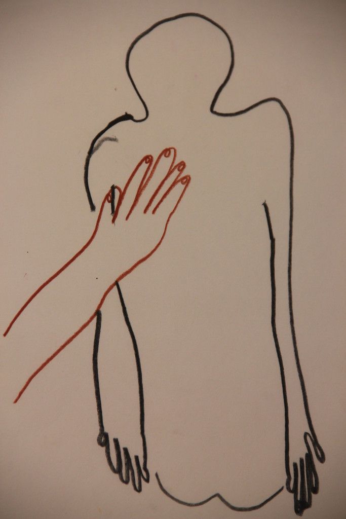 GÖFIS. (VN-ag) Ein Körper in Rückenansicht, von einer Hand berührt. Zwei Umrisse, zwei Farben, nichts weiter. Kann man eine Berührung schlichter und zugleich eindringlicher darstellen? Das Blatt stammt von Gesine Probst und ist zusammen mit anderen Werken aus dem Nachlass der Künstlerin in Göfis zu sehen.