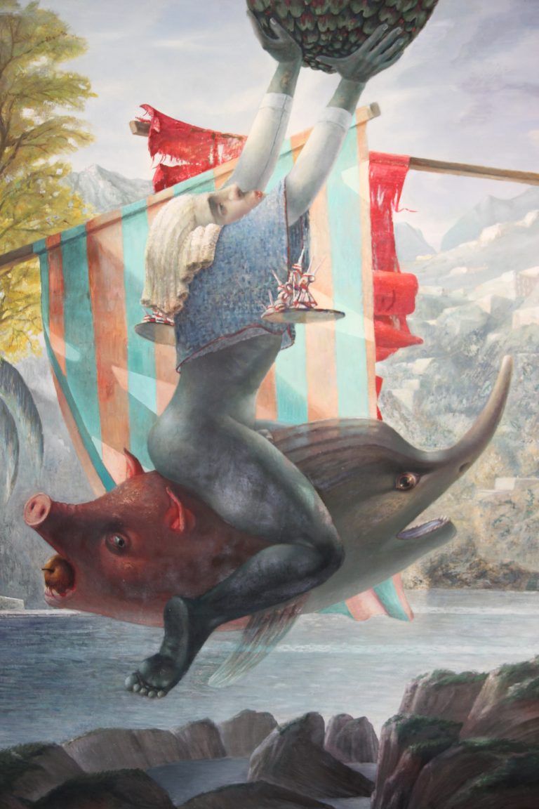 Marko Jakše schafft in seinen Gemälden geheimnisvolle, ferne Universen aus archaischen Landschaften und magischen Architekturen, bevölkert von imaginären Kreaturen, Mischwesen und bizarren Figuren. Welten, voller skurriler Ereignisse, die ihre BetrachterInnen nicht nur in den Bann ziehen, sondern geradezu in sich aufzusaugen scheinen. Das Motto der diesjährigen Biennale „The Milk of Dreams“, das dem in eine Welt voller Metamorphosen entführenden Buch der surrealistischen Künstlerin Leonora Carrington entstammt, ist wie maßgeschneidert für das Schaffen von Marko Jakše. Wenn Segelschiffe durch schroffes Felsgebirge fahren, eine Art Münchhausen an eine Artischocke geklammert auf einem Hybridwesen zwischen Schwein und Fisch durch die Luft fliegt, blutig-rote Fleischklumpen wie der Einsatz der Big Bosses auf dem Konferenz-/Spieltisch liegen oder eine einsame Toilette auf einem schachbrettartigen Podest inmitten einer labyrinthischen Architektur steht, dann verschmelzen Traum und Wirklichkeit, Vergangenheit und Zukunft. Der Entstehungsprozess der Gemälde verläuft niemals linear, es gibt keine vorbereitenden Skizzen, die Geschichten und die Malerei schlagen immer wieder einen Haken und tun es dem Hasen gleich, der wiederholt in den Bildern des Slowenen auftaucht. Irgendwann scheinen es die Bilder zu sein, die in diesem spontanen, offenen Prozess ein Eigenleben annehmen und sich selbst fertig malen.