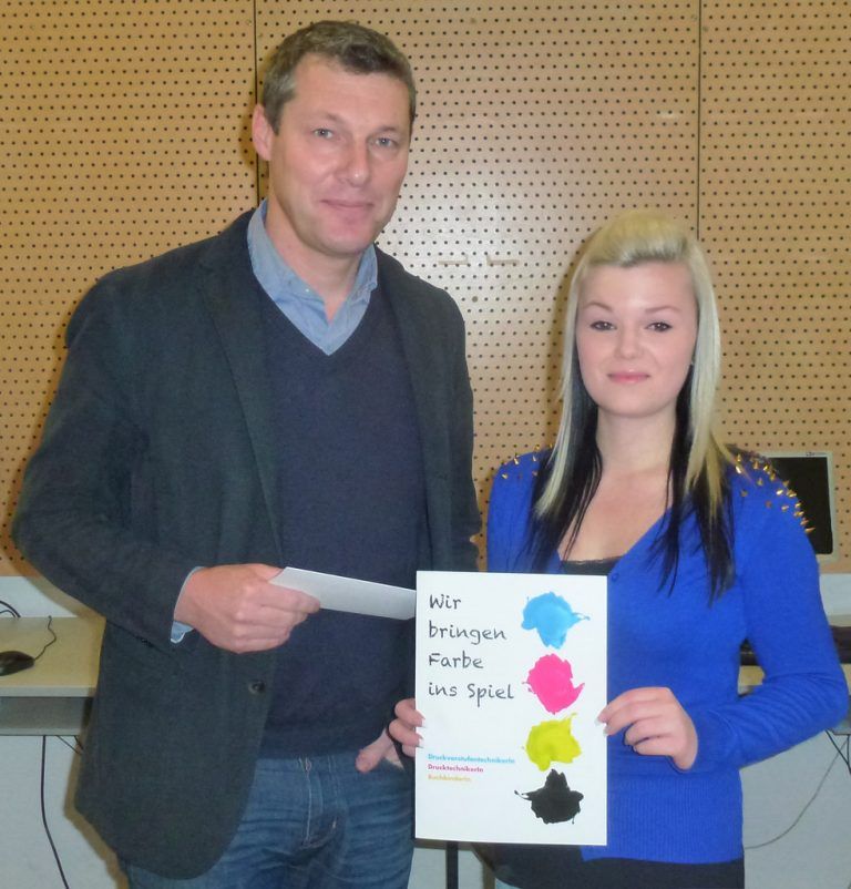 An der Landesberufsschule Bregenz 2 wurde über die Innung Druck ein Wettbewerb für die Gestaltung und Produktion eines Flyers für die BIFO-Messe durchgeführt. Den ersten Platz sicherte sich Selina Persa (Lehrbetrieb Digital Repro Service; im Bild mit IM Karlheinz Milz) vor Tina Frank (Vlbg Verlagsanstalt) und Björn Gangl (Druckerei Thurnher). Foto: lbs