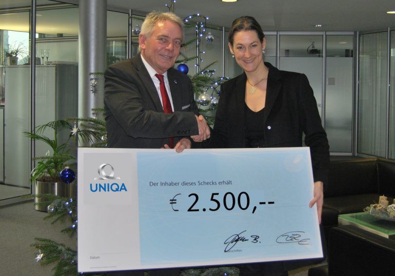 UNIQA-Landesdirektor Bruno Hutter überreichte an Frau Manuela Ortner vom Verein Sonnenblume einen Scheck über 2500 Euro. Die Spenden wurden auf der Jahresabschlussfeier der UNIQA-Landesdirektion von den Mitarbeitern gesammelt. Der Betrag kommt chronisch kranken Kindern und deren Familien in Vorarlberg zugute. Uniqa