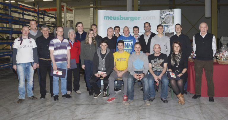 Die Wolfurter Firma Meusburger zeichnete 16 Personen aus, die insgesamt 190 Jahre im Unternehmen tätig sind. Der Dank galt Armin Chiesola und Heribert Rusch mit jeweils 25 Jahren, für zehn Jahre wurden Stefan Brombeis, Helmut Felder, Karin Fetz, Alexander Gmeiner, Kerstin Hämmerle, Wolfgang Hörburger, Miroslav Horna, Andreas Jakob, Thomas Läßer, Stefan Muxel, Martin Staggl, Martin Stenzel, Andreas Vogel und Fredi Wagner ausgezeichnet. Foto: Meusburger