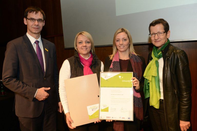Die Vereinbarkeit von Beruf und Familie ist für Sutterlüty ein großes Anliegen. Immerhin sind rund 80 Prozent der 700 Mitarbeiter(innen) Frauen. Das Engagement des Unternehmens wurde mit der Auszeichnung „Familienfreundlicher Betrieb“ gewürdigt. Im Bild: Eva Wolf und Barbara Außerwöger (beide Sutterlüty) mit LH Wallner und Landesrätin Greti Schmid.