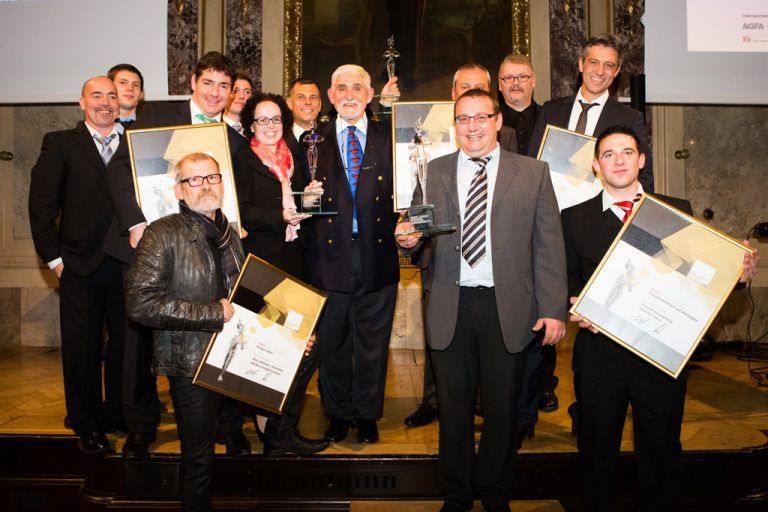 Der Verpackungsspezialist Rondo gewinnt den Golden Pixel Award, die österreichische Auszeichnung für fortschrittliche und innovative Druckprojekte, in der Kategorie Flexodirektdruck auf Wellpappe. Foto: Vertreter der Vorarlberger Sieger Rondo Ganahl, Buchdruckerei Lustenau, Druckerei Thurnher.