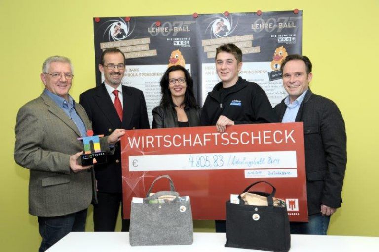 Beim diesjährigen Lehrlingsball der Vorarlberger Industrie fand eine Tombola zugunsten des Vereins Netz für Kinder statt. Spartenobmann Christoph Hinteregger, GF Michael Amann und Doppelmayr-Lehrling Daniel Moser überreichten einen Scheck in Höhe von € 4805,83 Euro an Obmann Franz Abbrederis und Conny Amann. Foto: NFK