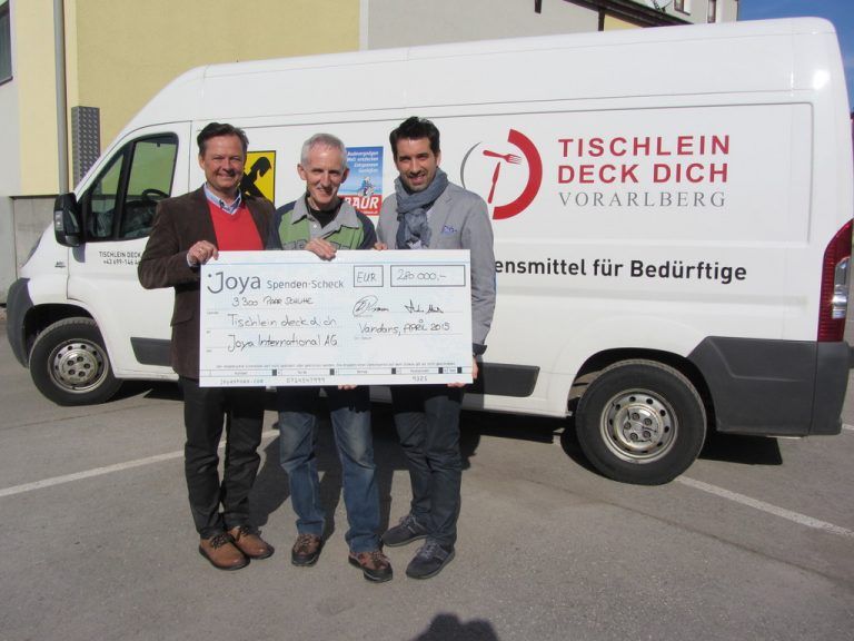 Schuhhersteller Joya hat „Tischlein deck dich“ 3300 Paar Schuhe im Wert von 280.000 Euro übergeben: Thorsten Rixmann (l.), Claudio Minder (Joya) und Elmar Stüttler (M.).