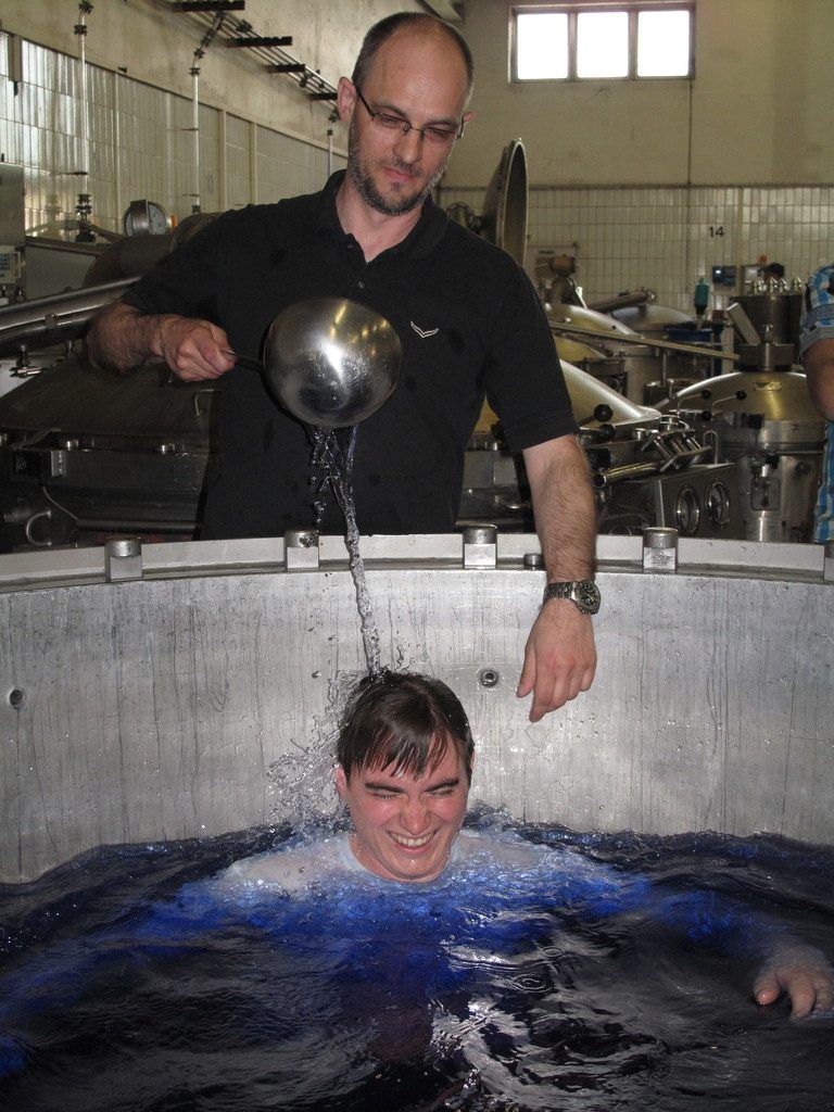 Alexander Matt hat nach dreieinhalb Jahren Ausbildung bei Schoeller in Hard die Lehre als Textilchemiker mit gutem Erfolg abgeschlossen. Für die Färbertaufe bereitete Ausbilder Rolf Dibowski ein wohltemperiertes und mit blauer Farbe versetztes Färbebad zu. Dort leistete Alexander den Eid ab, ein Schwur, Herz und Seele mit Purpurglanz zu durchfärben.
