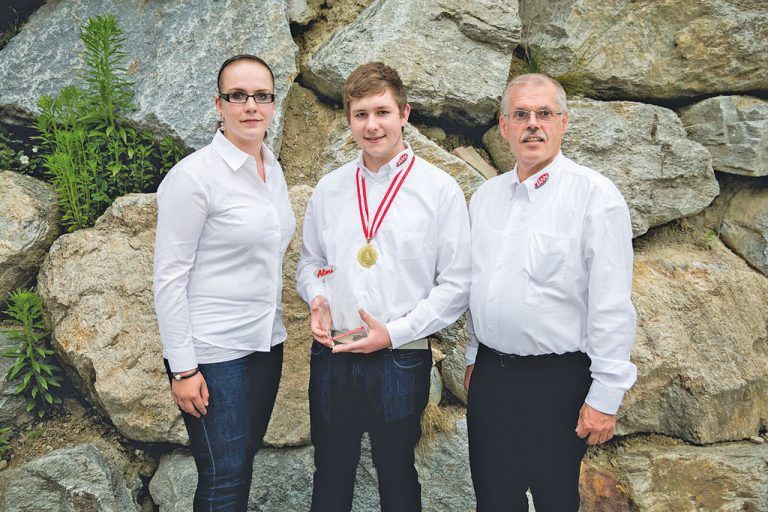Beim Bundeslehrlingswettbewerb der Fleischer, der heuer im benachbarten Tirol stattfand, holte sich der Vorarlberger Tobias Geuze (Lehrbetrieb Tann, Dornbirn) die Bronzemedaille. Foto: v. l.: Trainerin Rebecca Richtfeld, Bronzemedaillengewinner Tobias Geuze und Ernst Marte, Leiter der Firma Tann. Foto: tann