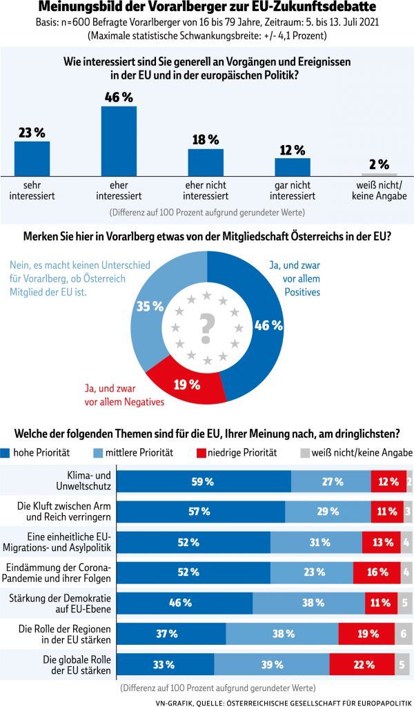 Die Umfragen in den Bundesländern erlauben bereits Rückschlüsse auf das Stimmungsbild vor Ort. 69 Prozent der Menschen interessieren sich für Vorgänge und Ereignisse in der EU und in der europäischen Politik: 46 Prozent sind eher interessiert, 23 Prozent sogar sehr interessiert. Fast die Hälfte, 46 Prozent, merken an der EU-Mitgliedschaft vor allem positive, 19 Prozent negative Aspekte. 35 Prozent sehen für Vorarlberg keinen Unterschied, ob Österreich Teil der EU ist oder nicht. Mit Blick auf die Coronapandemie halten 37 Prozent die Mitgliedschaft für eine eher vorteilhafte Sache, 23 Prozent orten eher einen Nachteil, 32 Prozent sehen keinen Unterschied.
