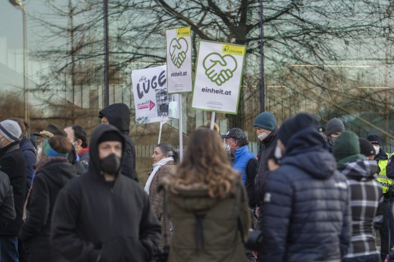 “Jeden Morgen und jeden Abend bringt ihr die Coronazahlen, das macht einen doch kaputt”, beklagt sich ein Spätankömmling, der sich beim Milchpilz in den Protestzug eingliedert. Österreich müsse wieder mehr Mut wagen, so wie die Schweiz. Wenige Meter weiter straft die Polizei einen Demonstranten, der rauchte statt eine Maske zu tragen. “Es kann doch nicht Aufgabe der Polizei sein, hier die Maskenpflicht zu kontrollieren. Die sollen lieber in die Achsiedlung”, schüttelt der junge Mann den Kopf.
