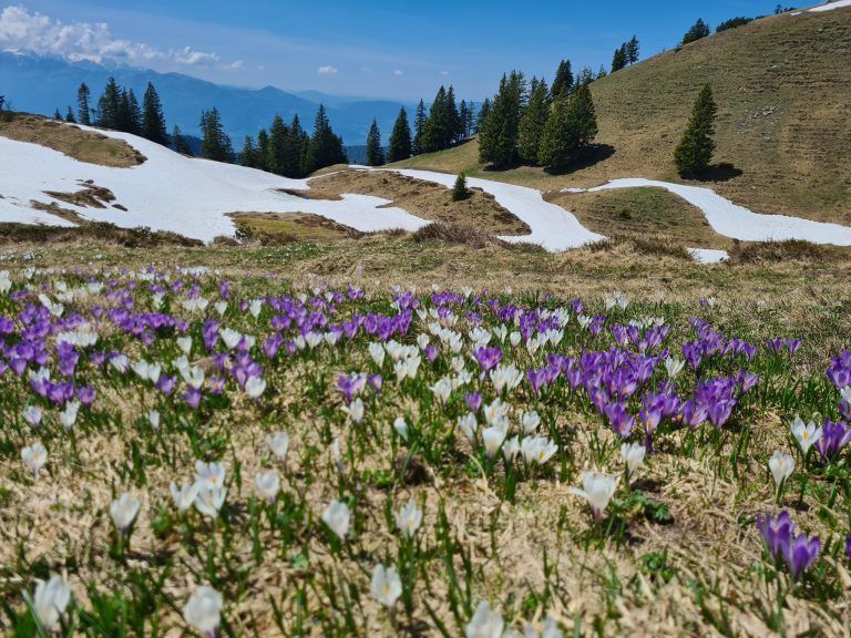 Eine Verschnaufpause hat man bei der nächsten Alpe, der Unteren Saluveralpe. Hier durchstreift man ein Hochplateau mit vielen Weideflächen, die vom Gebirgsbach durchzogen sind. Wir wandern durch das mit 7,6 Hektar größte Naturschutzgebiet Vorarlbergs bis hoch zum Freschenhaus, das ab 16. Juni geöffnet hat. Von dort ist es nicht mehr weit bis zum Gipfel. Auf der Ebene wandern wir zur nächsten Kreuzung und halten uns dort links. Nach dem letzten Aufschwung geht es nunmehr eben zum Gipfelkreuz, von dem wir einen fantastischen Rundumblick haben, der bis zum Piz Buin reicht. Unzählige Gipfel türmen sich am Horizont auf.
