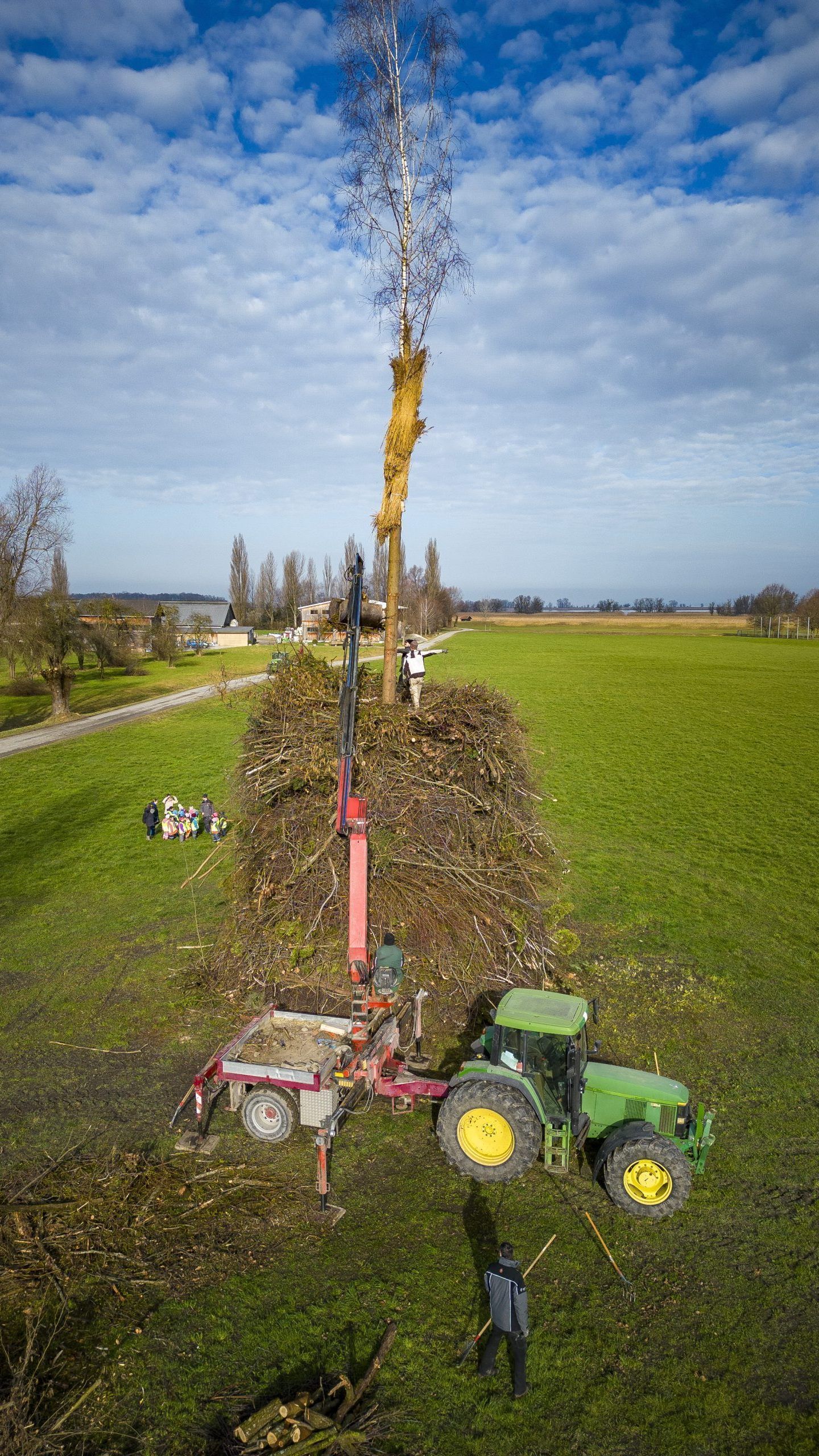 In den Funken kommen bei der Funkenbande lediglich Äste und alte Christbäume, die kreuzweise aufeinandergeschichtet werden, sowie oben drauf und unten herum Schilf. Die Funkenstange misst knapp 20 Meter. Da es nicht mehr so hohe und so viele Birken mit einen ausreichend dickem Stamm gibt, setzt man in Fußach mittlerweile auf eine zweiteilige, aneinandergeschraubte Stange. „Unten Tanne, damit es hält und oben Birke, da mit es schön aussieht“, erläutert Funkenbanden-Mitglied Bertram Bezler, der gerade die Astreste auf der Wiese zusammenrecht.