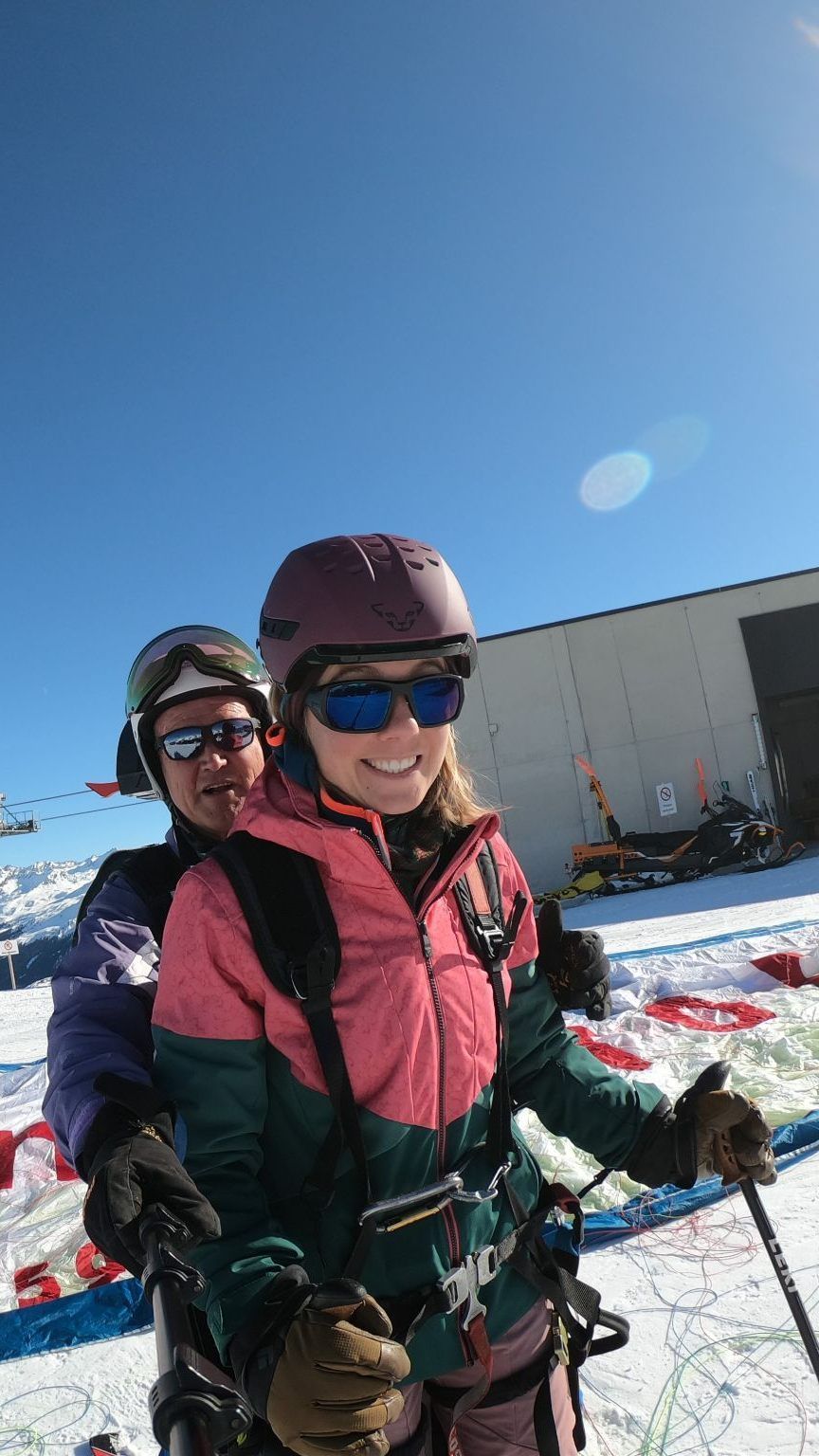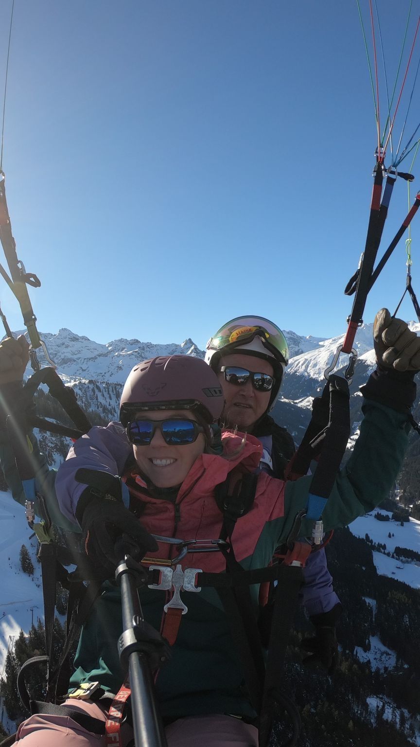 „Heute haben wir Traumbedingungen“, freut sich Werner Burger. Es ist mein zweiter Gleitschirmflug. Im Sommer sind Werner und ich schon einmal bei der Versettla-Bergstation mit dem Gleitschirm gestartet. Es macht einen Unterschied, ob man zu Fuß oder mit Skiern startet. Während ich im Sommer überhaupt nicht nervös war, war ich es jetzt umso mehr. Was, wenn ich mit den Skiern hinfalle, noch bevor wir in der Luft sind? Oder wenn ich in der Luft Skier und Stock verliere? Doch am Ende war es weniger schlimm als gedacht und sogar viel leichter als im Sommer, da man mit den Skiern schneller an Geschwindigkeit zunimmt. Zu Fuß hingegen kämpft man viel mehr gegen den Widerstand des Gleitschirmes an, so, als ob man auf der Stelle laufen würde.