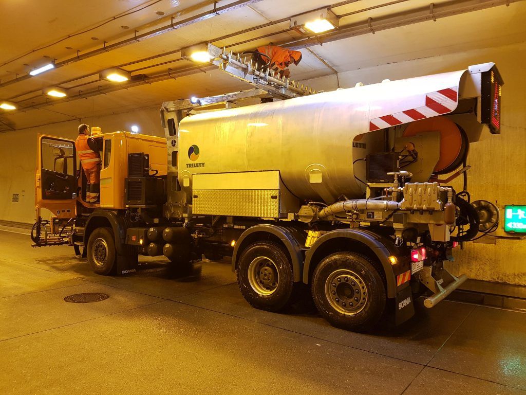 Die gute Nachricht: Die meisten Arbeiten finden in der Nacht statt, wenn wenig Verkehr herrscht. Dabei kommen High-Tech und die Erfahrung der Asfinag-Mitarbeiter zum Einsatz: Ein Waschzug besteht meist aus bis zu fünf Lkw, die in erster Linie Tunnelwände, Decke und Fahrbahn reinigen. Ein Wagen trägt dabei das Waschmittel auf die Wände auf, das nächste Fahrzeug reinigt die Wände und Decken mit rotierenden Bürsten und Hochdruck-Geräten.
