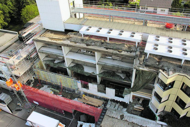Nachdem die Abbrucharbeiten bereits abgeschlossen werden konnten, ist man aktuell mit den Baumeisterarbeiten beschäftigt. Neben dem Fenstereinbau und den Trockenbauarbeiten wurde inzwischen auch mit den Rohinstallationen begonnen. Parallel dazu wird an der Unterkonstruktion der Fassade gearbeitet. Diese wird an den zwischen 2010 und 2014 errichteten Neubau angepasst, was das Verschwinden der markanten „Sägezahn-Fassade“ zur Folge hat.