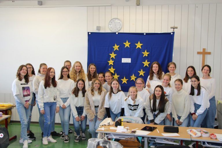 Schüler und Lehrer stellten zahlreiche Aktionen auf die Beine, um klarzumachen, was der Kontinent und die Europäische Union zu bieten haben. Während in der Küche die kulinarische Vielfalt die ganze Woche über auf den Teller gebracht wurde, tauchte die Klasse 1c in die vielseitige Sprachenwelt Europas ab. Dabei galt es, alltägliche Begriffe in so viele EU-Amtssprachen wie möglich zu übersetzen. So staunten die Jugendlichen nicht schlecht, dass etwa in Litauten von „bebesis“, in Frankreich von „nuage“, in Ungarn von „felhő“ und in Slowenien von „oblak“ die Rede ist, wenn sich eine Wolke am Himmelszelt zeigt. Nur ein paar Klassenzimmer weiter – in der Klasse 1a – wurde hingegen eine Europaflagge gebastelt. Jeder der zwölf darauf abgebildeten Sterne stand für einen Wert, den die Europäische Union verkörpert wie beispielsweise Frieden oder Stabilität. In Kleingruppen hatten sich die Schülerinnen und Schüler in ihren jeweiligen Aspekt eingearbeitet, um ihn dann der Klasse zu präsentieren und so Stern für Stern die Flagge zu vollenden.