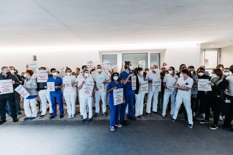 Wie LKH-Zentralbetriebsrat und Vorsitzender der GÖD Gesundheitsgewerkschaft, Thomas Steurer, auf VN-Nachfrage bestätigte, wurde die Einhaltung der Bestimmung vor Ort durch die Exekutive kontrolliert. “Wir lassen uns dadurch aber weder einschränken noch einschüchtern, sondern werden einen möglichen weiteren Protest dann eben entsprechend anzeigen und wieder vor den Türen demonstrieren”, kündigte Steurer an, so lange aktiv zu bleiben, bis endlich etwas passiert. Die Änderung im Protestfahrplan konnte aber kaum jemand von der Teilnahme abschrecken. Diesmal setzten rund 350 Beschäftigte aus dem Gesundheitsbereich mit ihrem Auftreten ein Zeichen gegen die Untätigkeit der Politik im Kampf gegen den akuten Personalmangel.