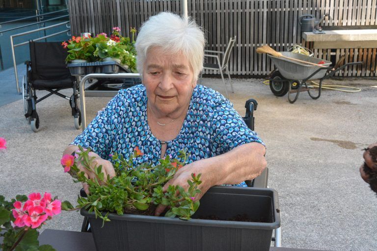 Maria Sandtner (79) gefiel das Arbeiten mit der Erde und den Blumen sehr und sie genoss es sichtlich, die Erde zwischen ihren Fingern zu spüren. “Bei uns auf der Demenzstation arbeiten wir viel mit Erinnerungen und positiven Erlebnissen aus der Vergangenheit”, so Hämmerle. Alles, was die Bewohner freut, ist schön. “Auch wenn sie viele Dinge vergessen haben, das Herz hat keine Demenz und erinnert sich an alles Schöne, was sie in ihrem Leben erfahren durften”, so Hämmerle. Den ganzen Sommer über dürfen die Bewohnerinnen ihre Blumenkistchen pflegen und täglich mit Wasser versorgen, damit sie noch lange Freude an den bunten und gut riechenden Pflanzen haben. BVS